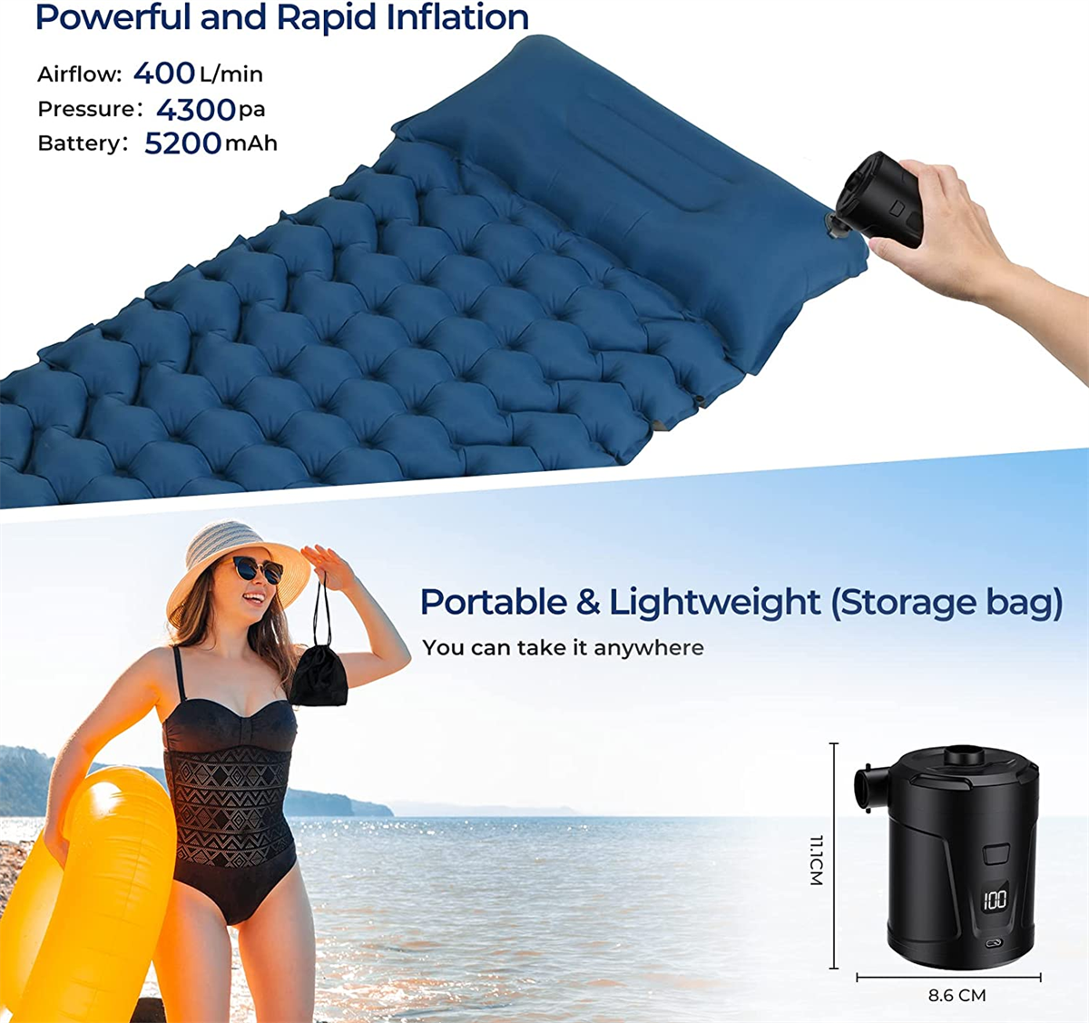 3. Fast inflator with 3 nozzles: With 260L/min air flow, our inflator air pump can quickly inflate the inflator products, saving time and manpower. Three nozzles of different sizes are suitable for inflatable sleeping MATS, swimming rings, inflatable toys, pillows and children‘s swimming pools.
